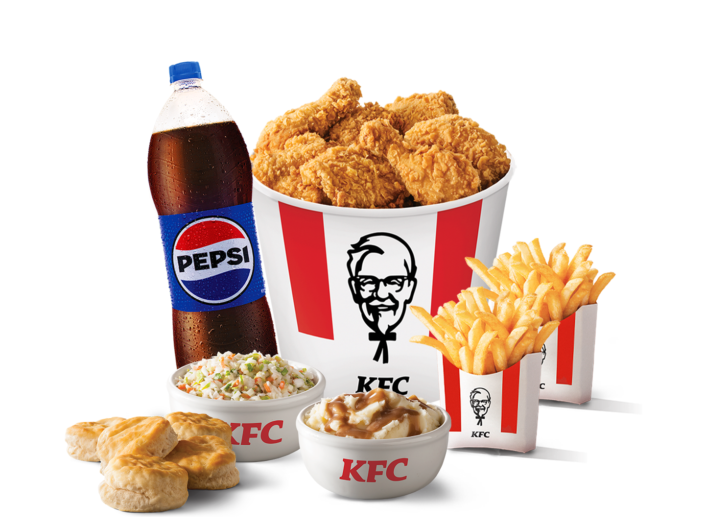 8 piezas de pollo de tu receta favorita, 4 complementos, 4 biscuit, 1 refresco 2 L.
